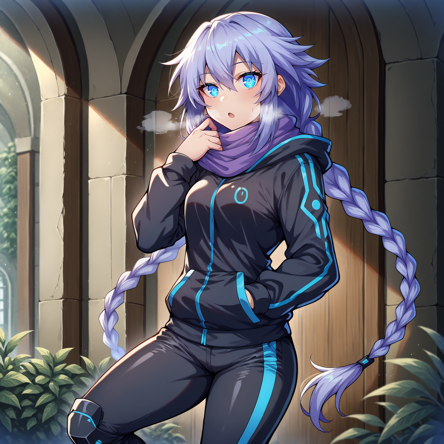 purple scarf, black jacket, hooded jacket, hood down, light blue trim, black pants, black boots